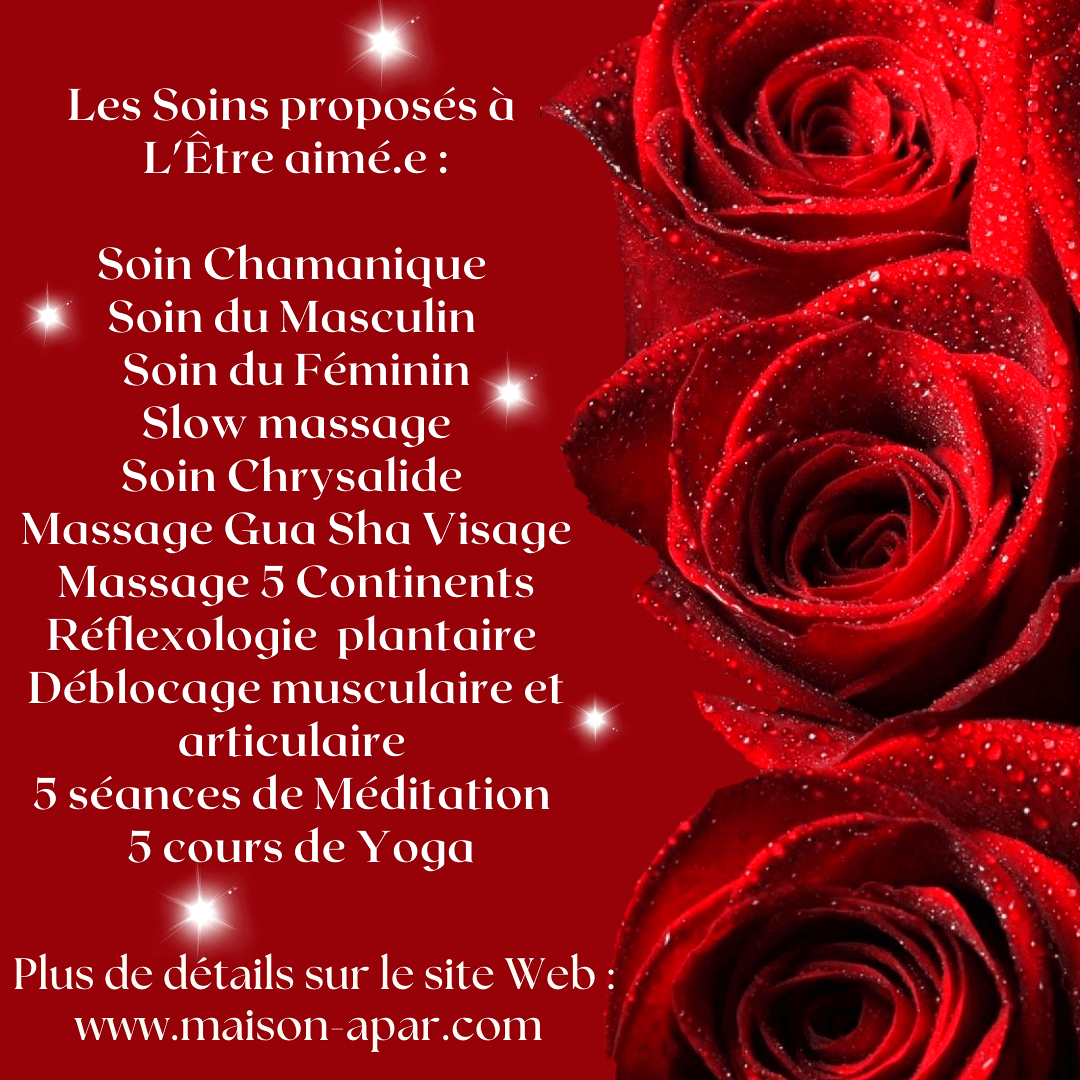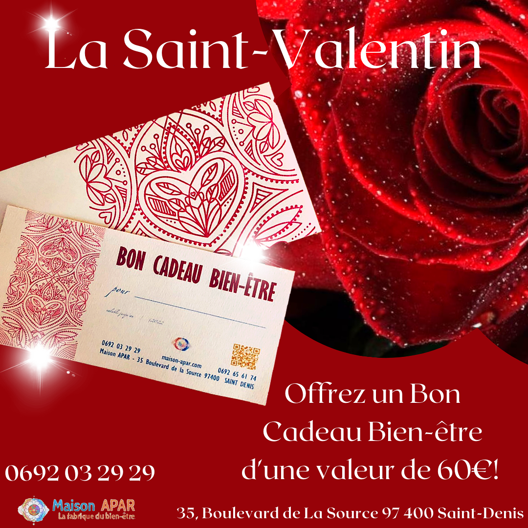 La Maison Apar vous propose un Bon cadeau Bien-être à offrir à l'être aimé.e pour la Saint-Valentin. Diverses prestations d'une valeur unique de 60€ sont disponibles pour faire des heureux (euses).