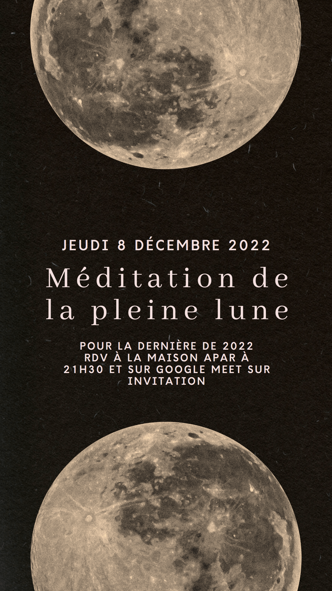 jeudi 8 décembre 2022 à 21h30 méditation de la pleine lune à la maison APAR et sur google meet sur invitation. Réalisé